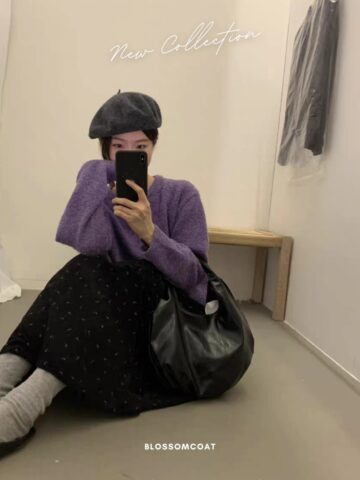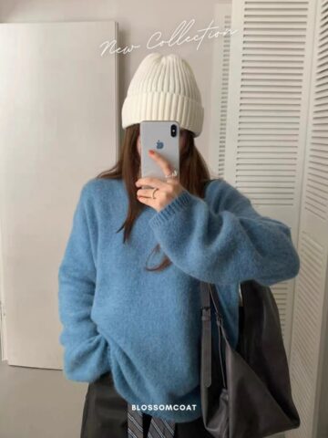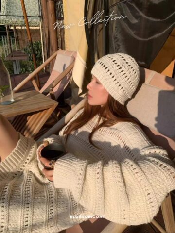 B5297 เสื้อไหมพรมคอกลมถักห่าง+หมวก มี 2 สี