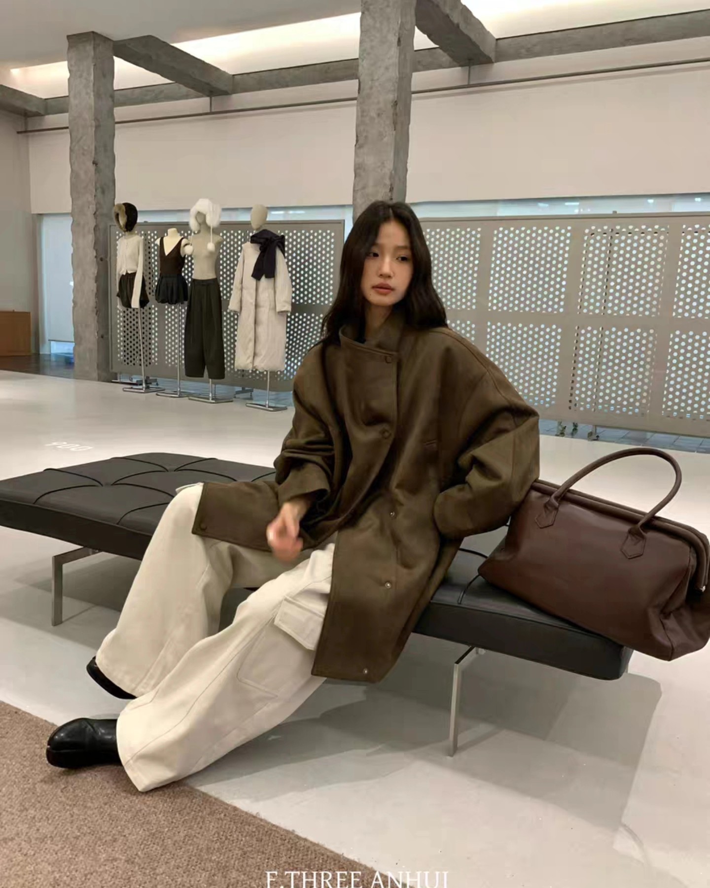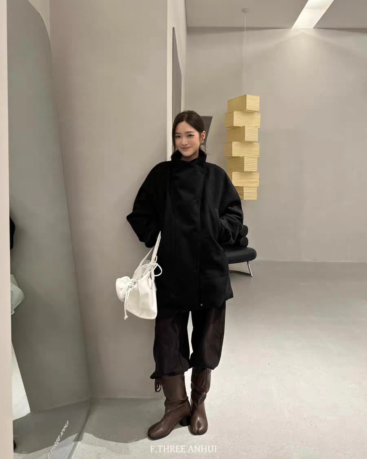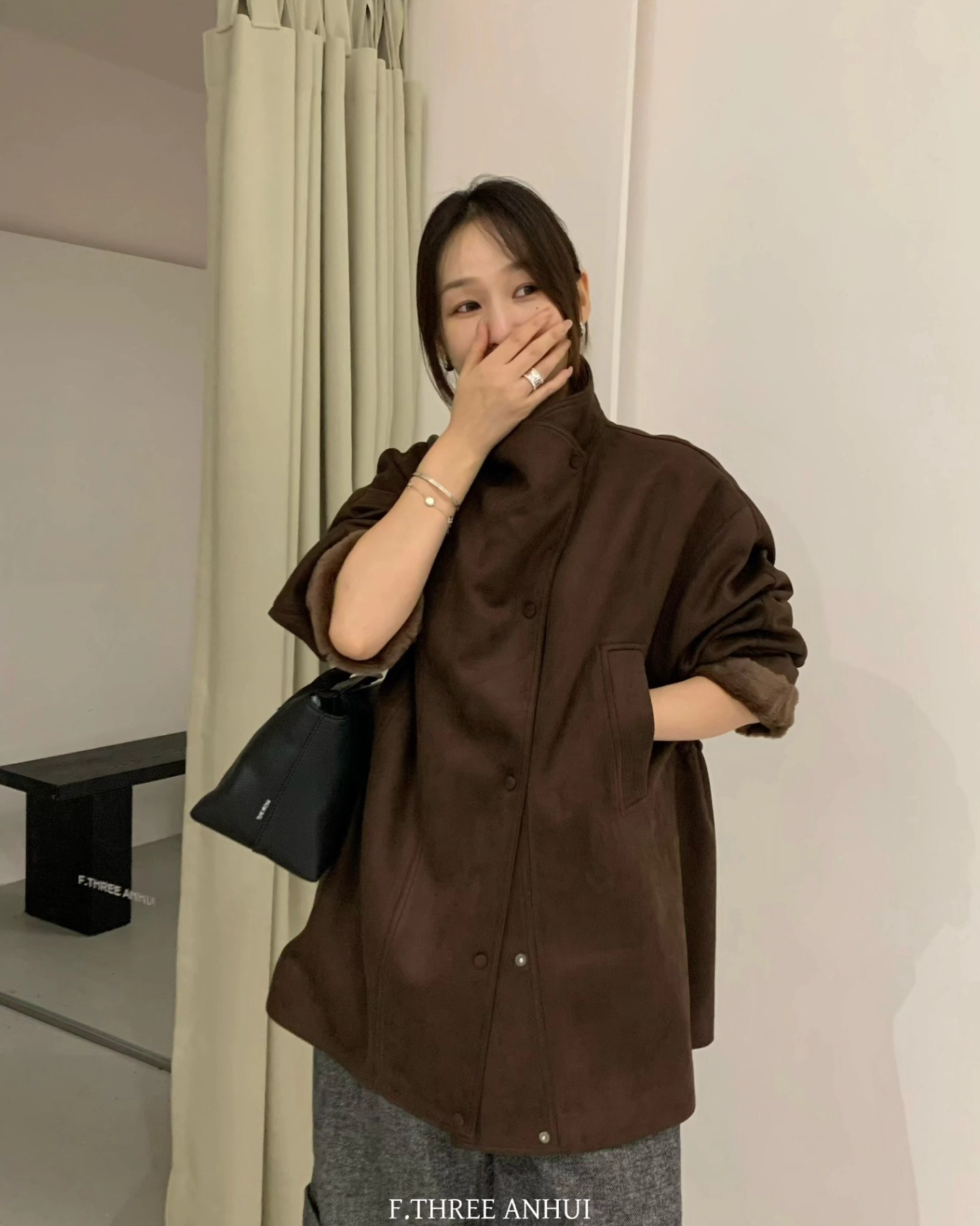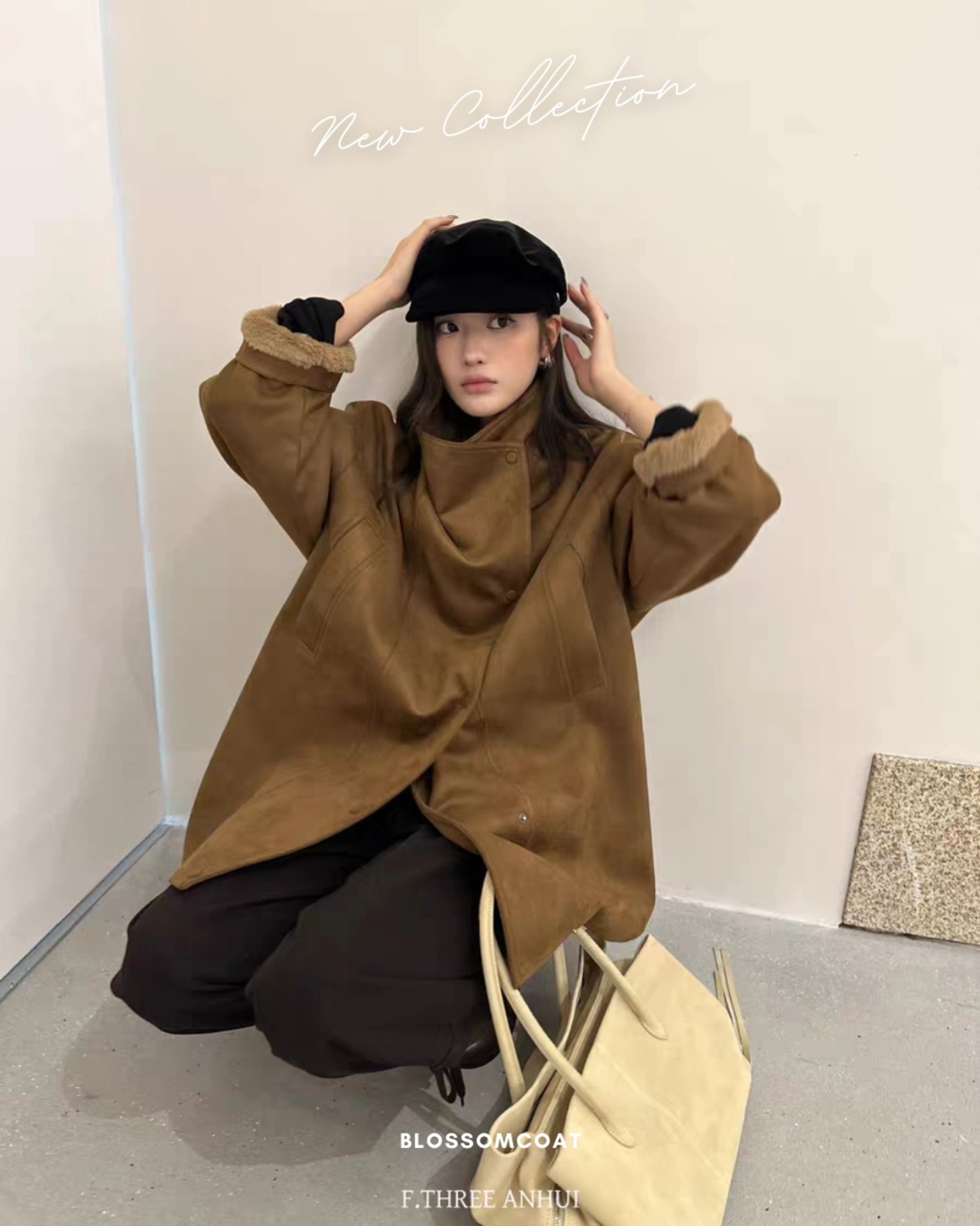 B1305 โค้ทหนังกลับบุขนคอตั้งเล็กน้อย