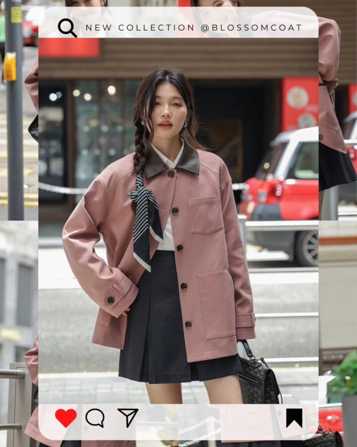 B2192 เทรนโค้ท คอปกหนัง สีชมพู