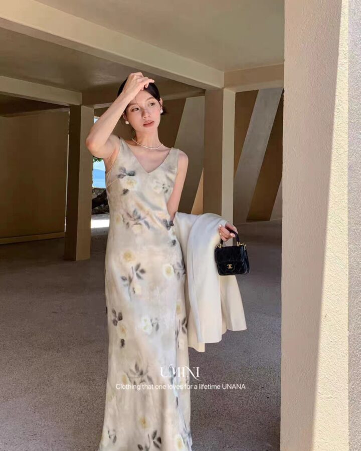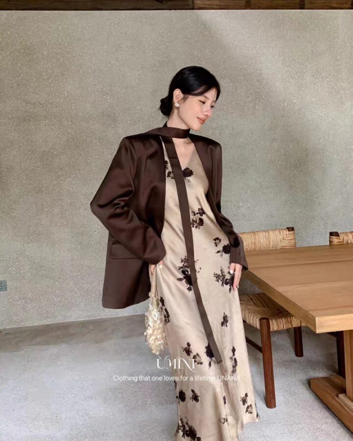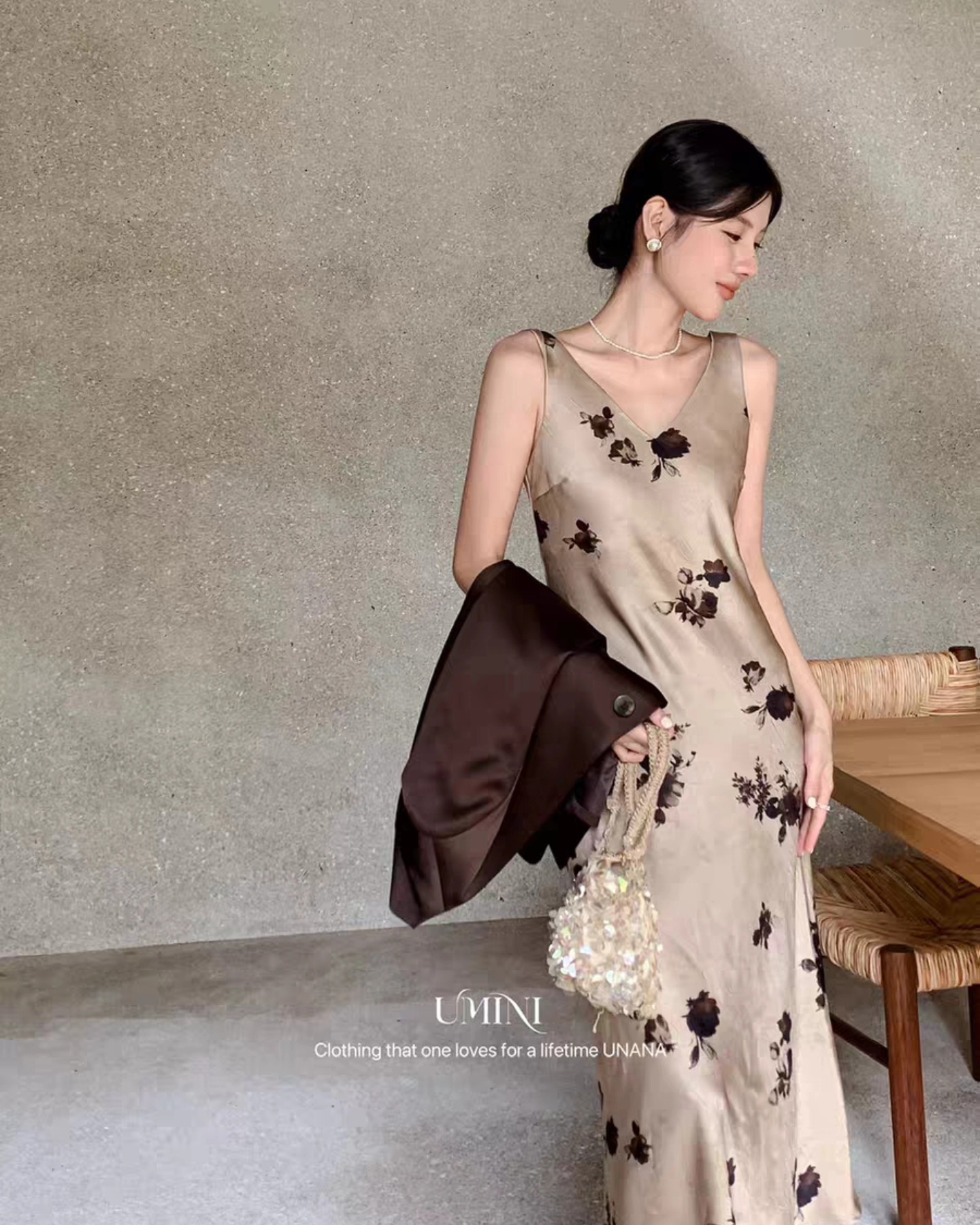 B6104 เดรสยาวผ้าลื่นลายดอก