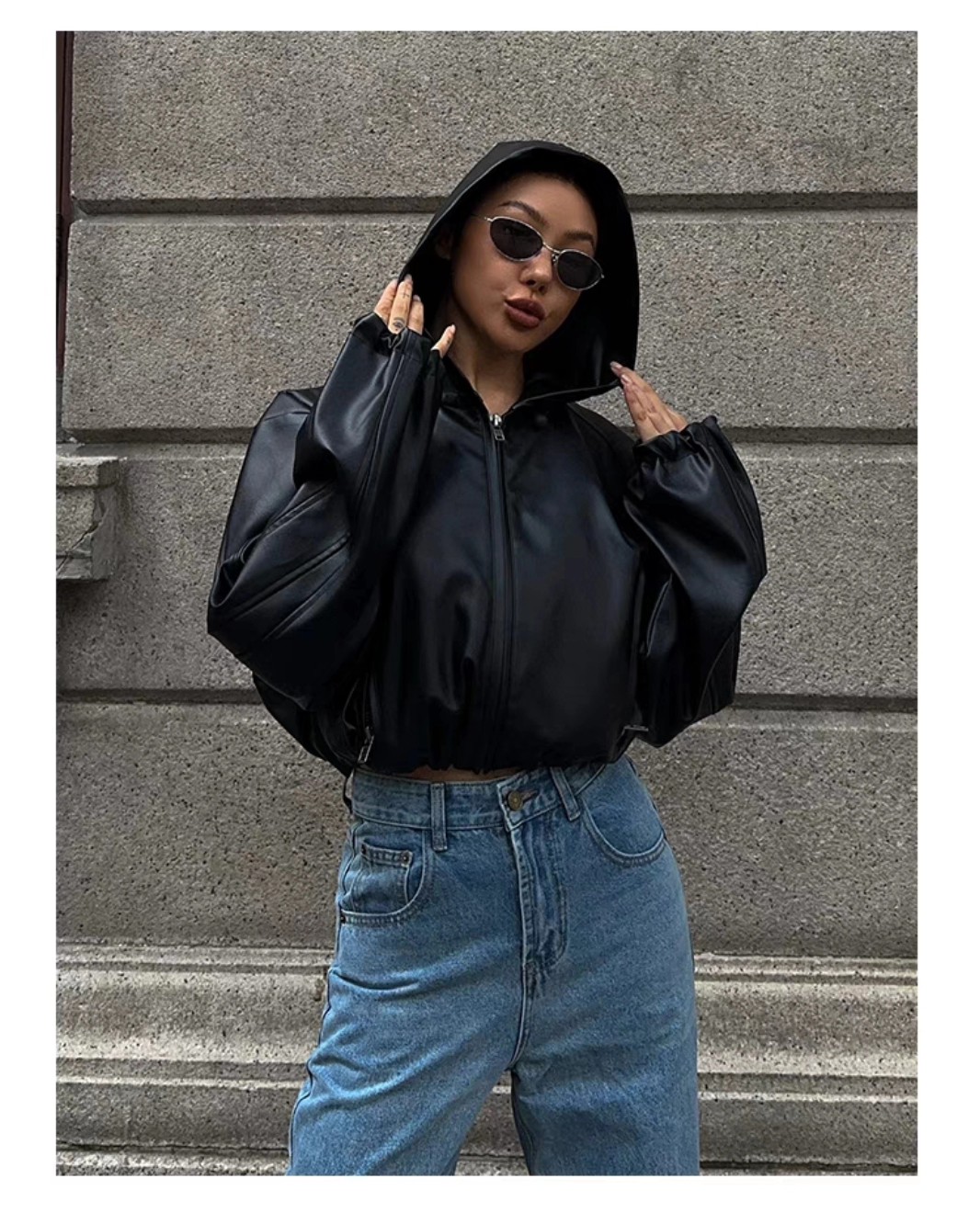 B3126 เสื้อหนังครอป มีฮู้ด ไม่บุขน