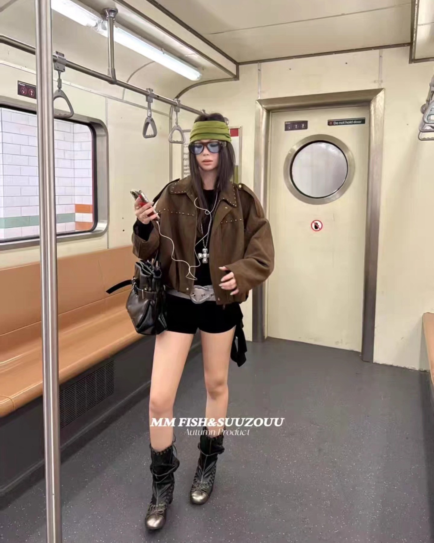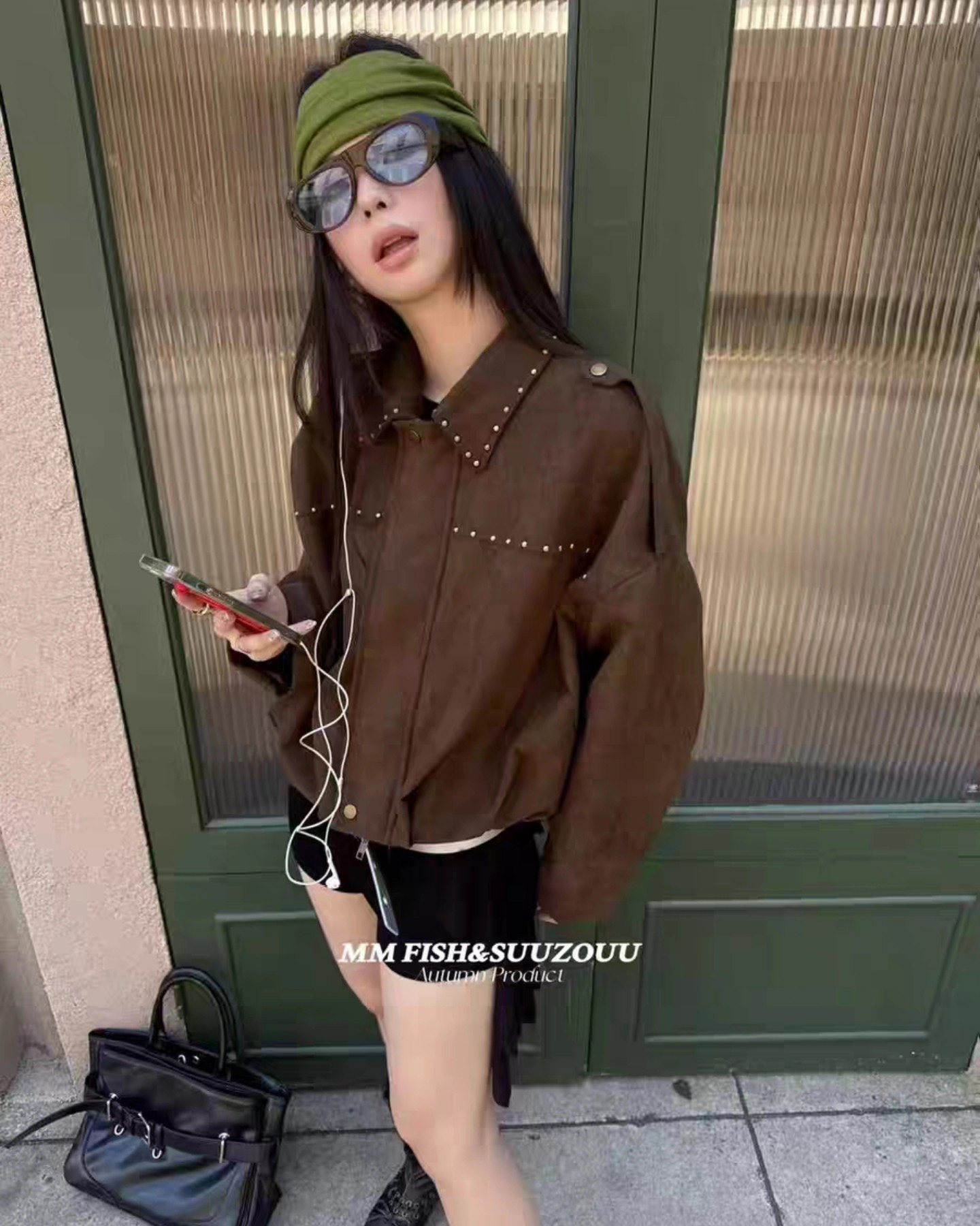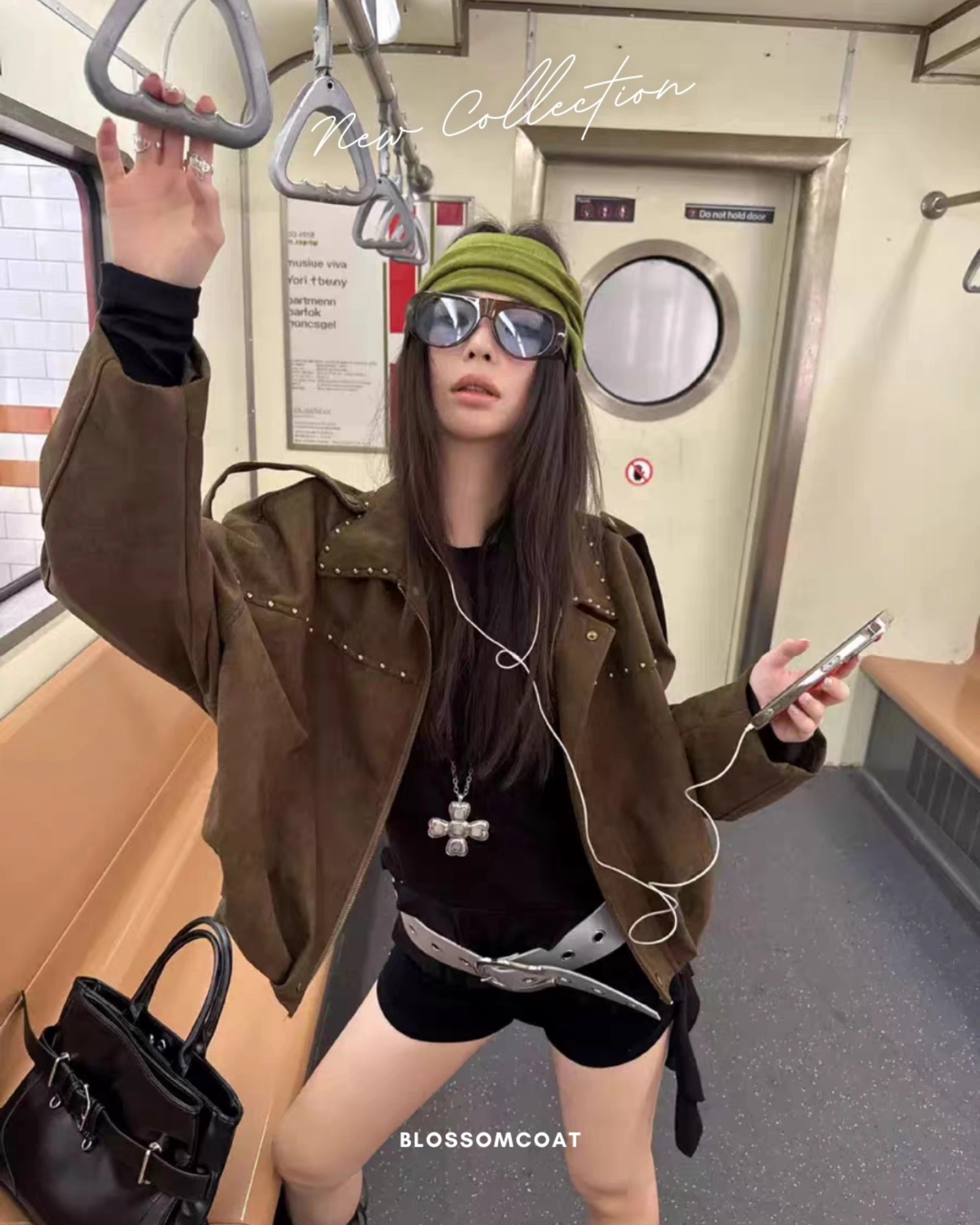 B3208 เสื้อแจคเกตหนังกลับ ตกแต่งหมุด