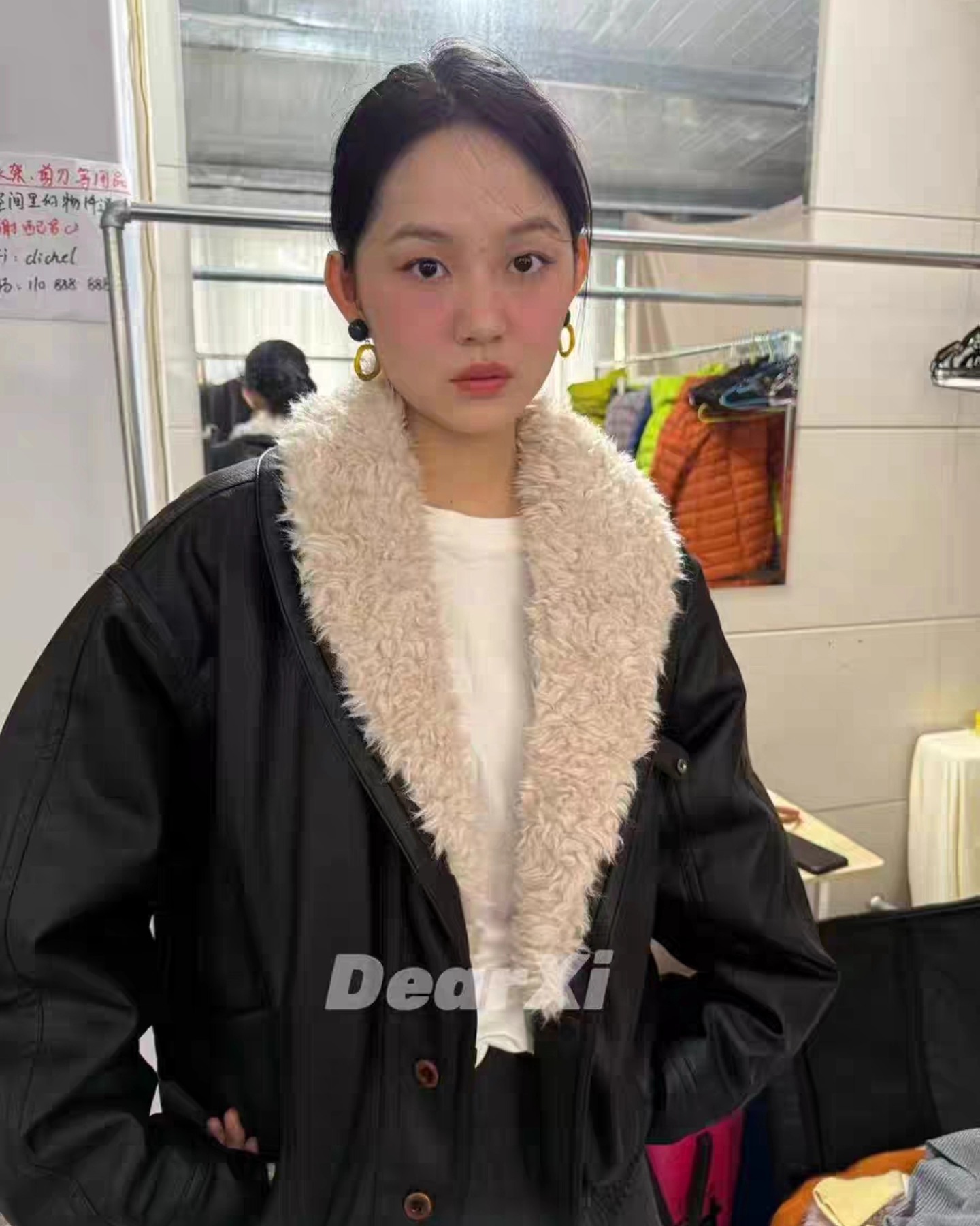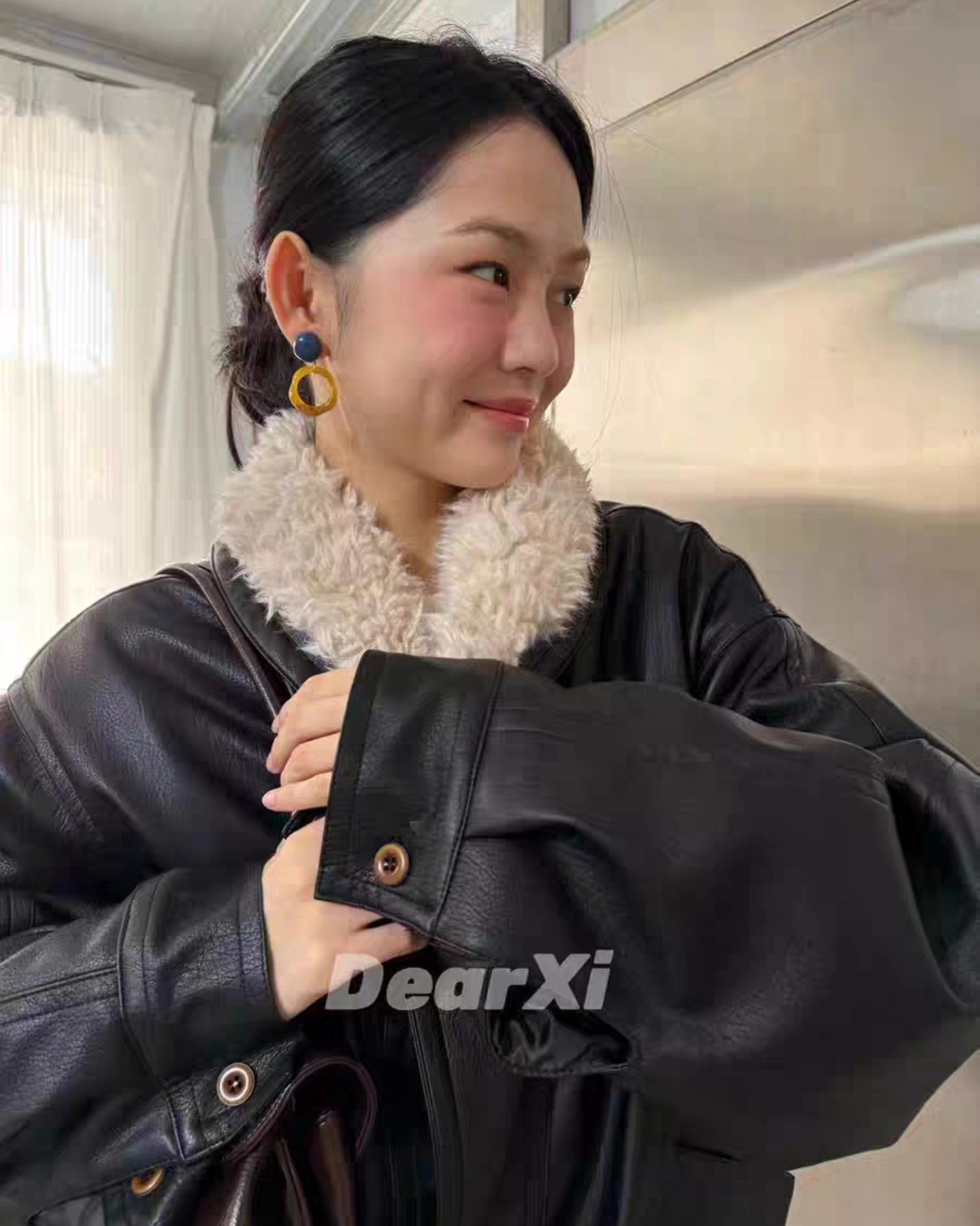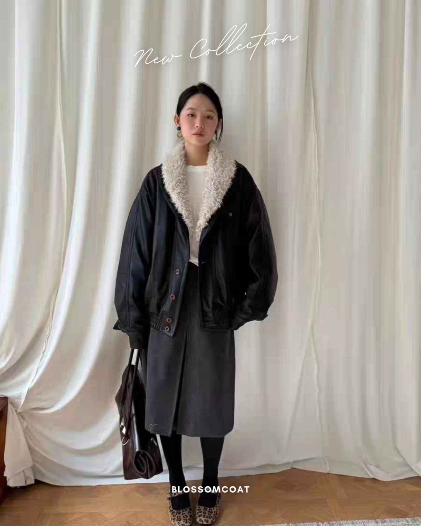 B3243 เสื้อแจคเกตหนัง คอปกขนแกะ