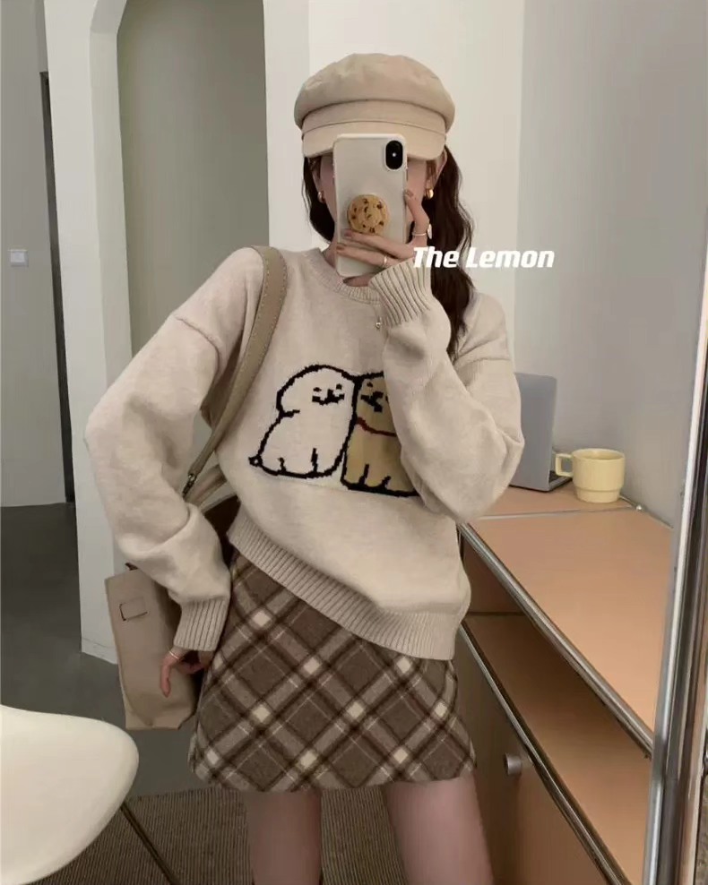 B5214 เสื้อไหมพรม คอกลม ลายหมาสองตัว