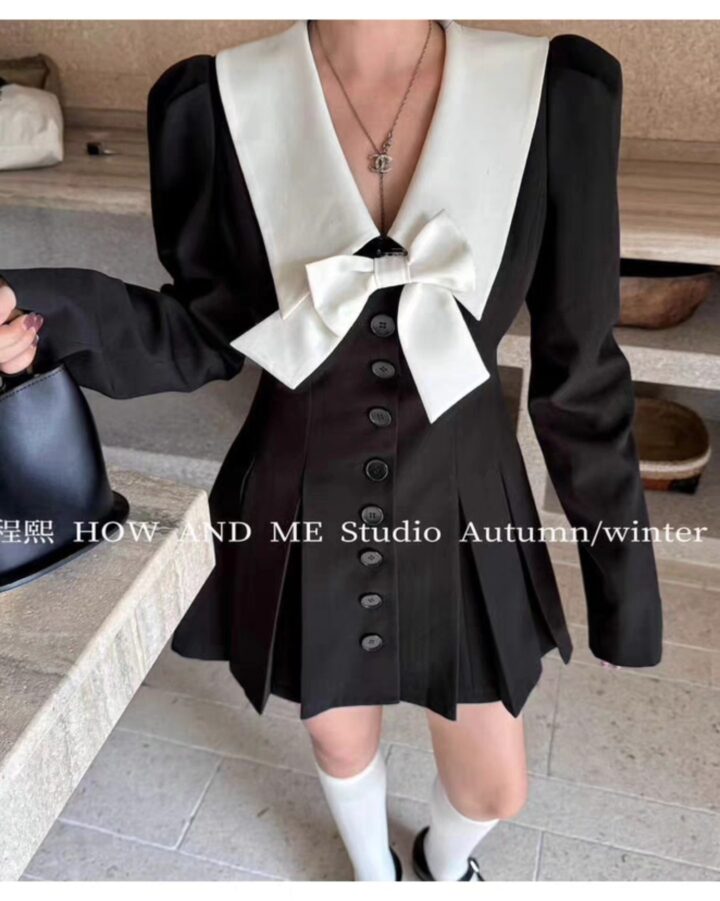 B7128 ชุดเดรสคอปกขาวโบว์ผ้าไม่หนา