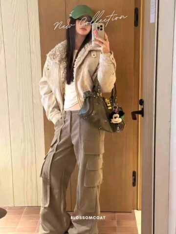 B3239 เสื้อแจคเกตหนังกลับบุขน +กระเป๋าลายเสือ