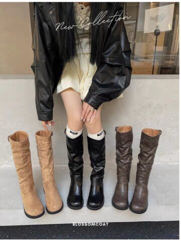A5211 รองเท้าบูทยาวหนังกลับ หัวมน ปลายแต่งเข็มขัด